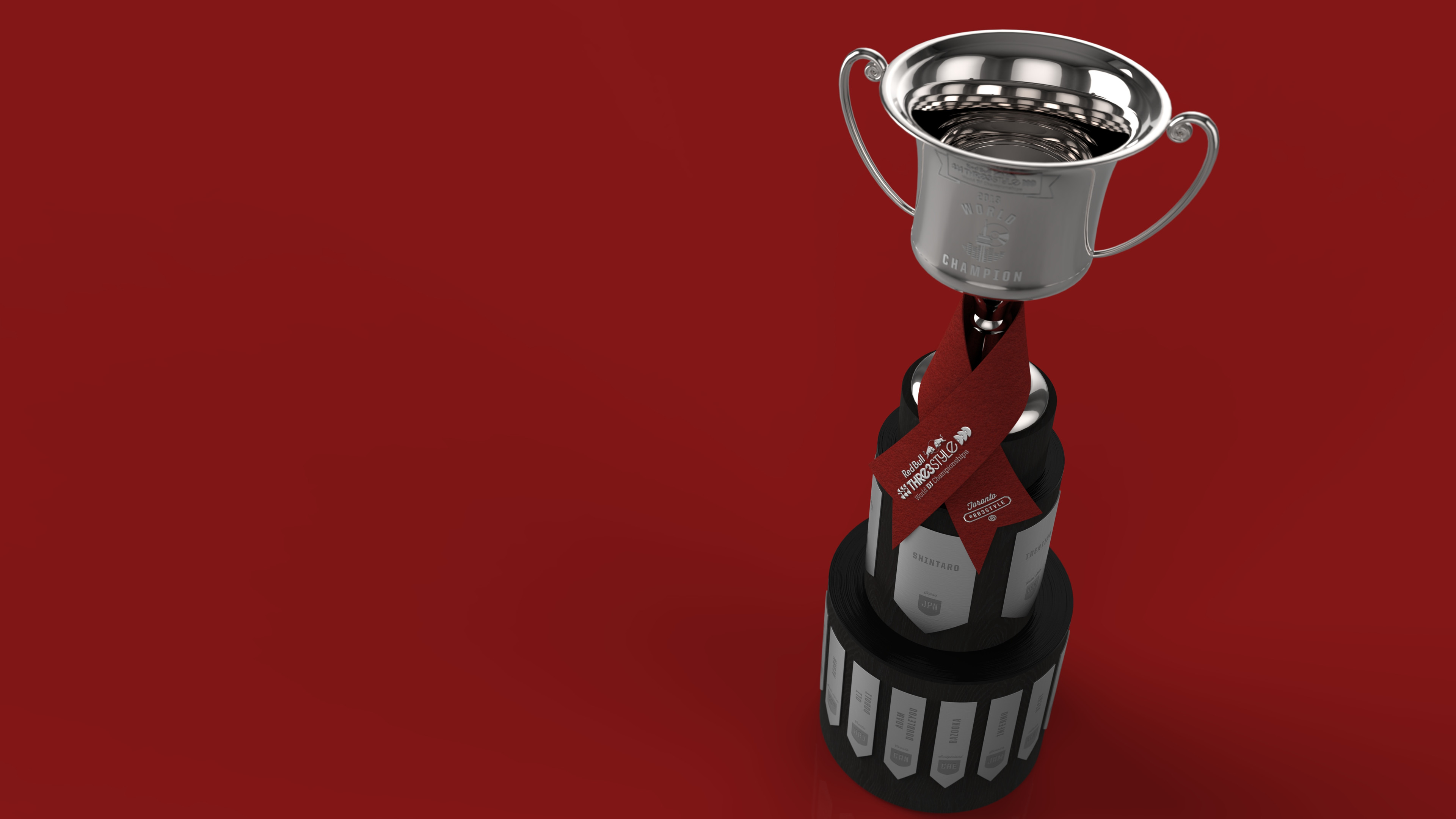 When Toronto hosted the 2013 Red Bull Thre3style World Finals, a striking trophy was needed. The bottom tier of the trophy has laser-etched plaques for all of the first round entrants. The second tier displays a plaque for each competitor in the final night, with the winner facing forward. The tiers are topped with vinyl records to subtly bring the theme of the event into the signature piece.